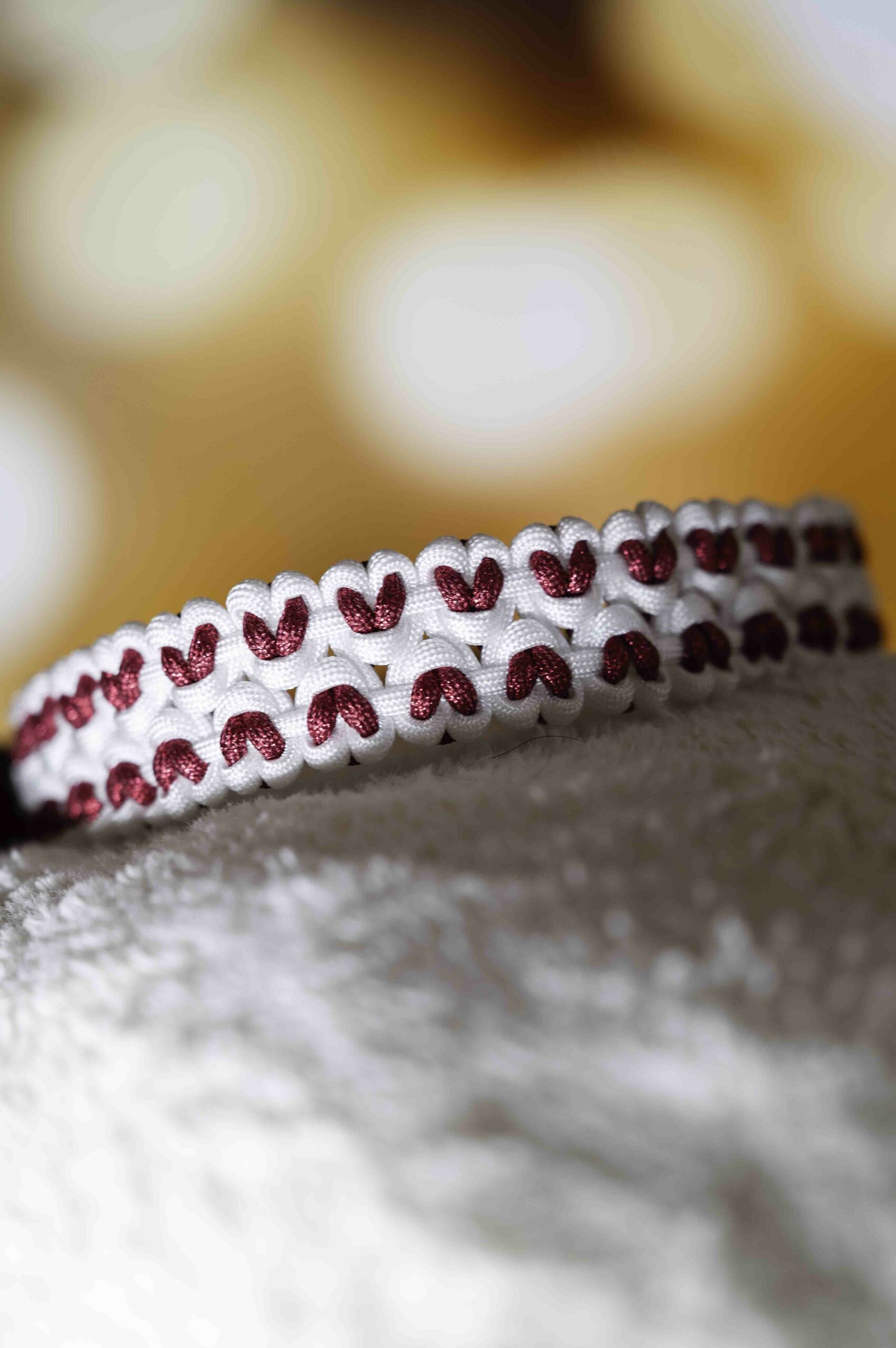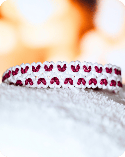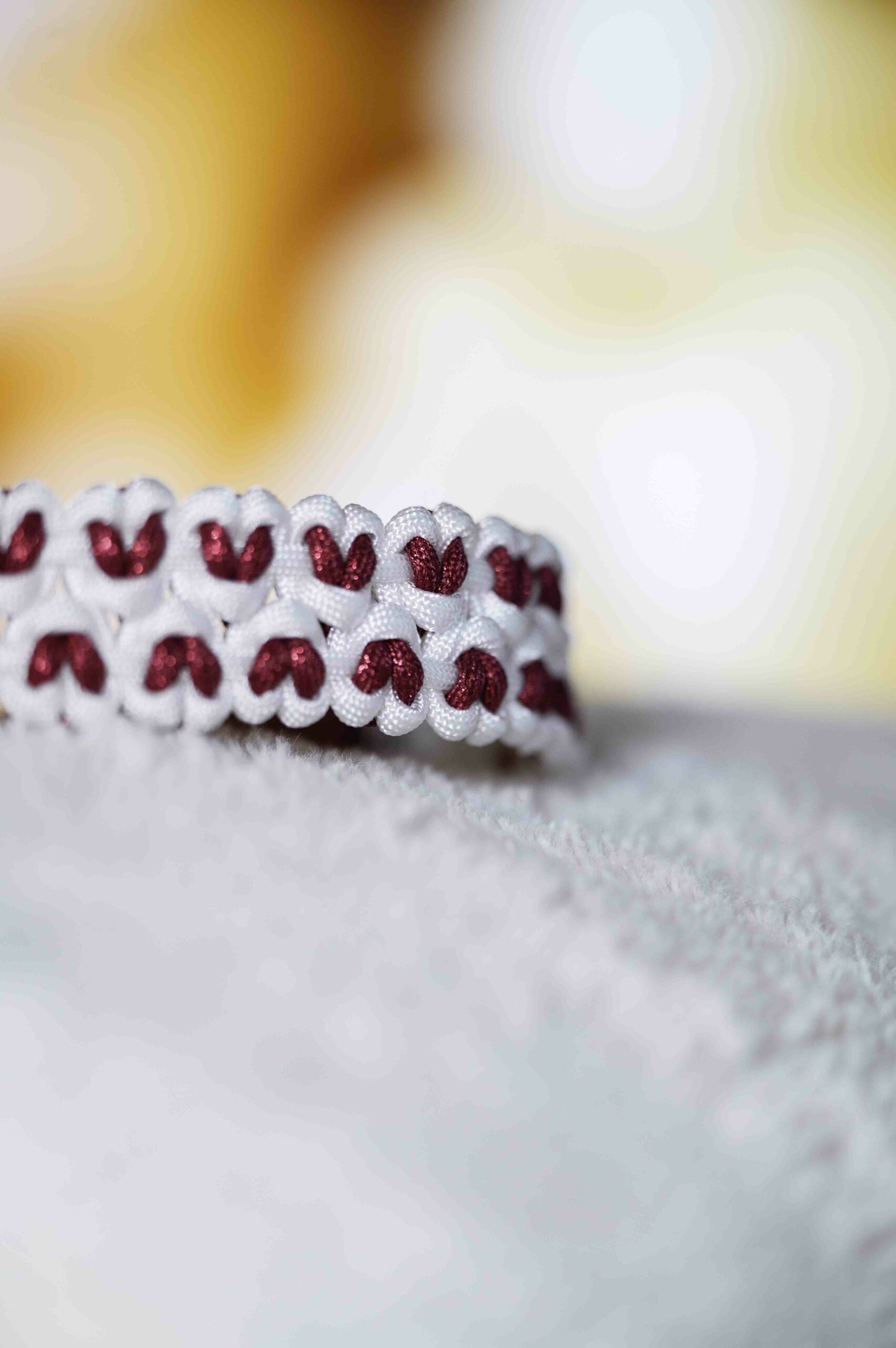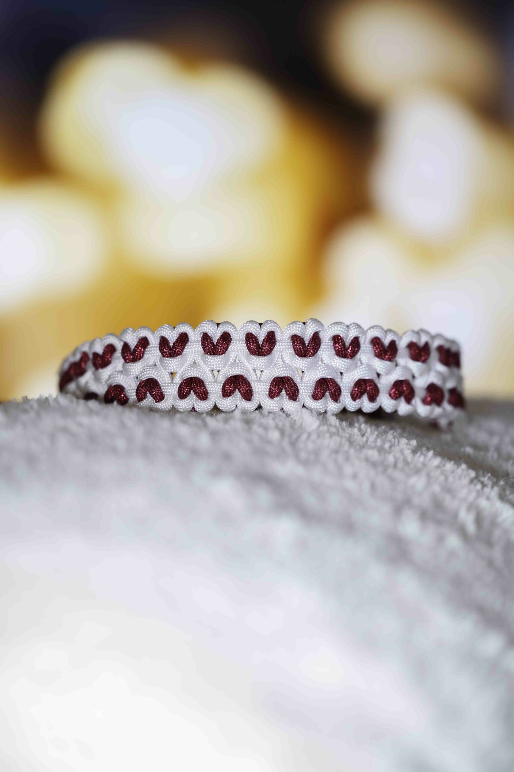 Un tressage fin, régulier, presque soyeux, avec des cœurs rouges scintillants sertis dans un blanc immaculé.