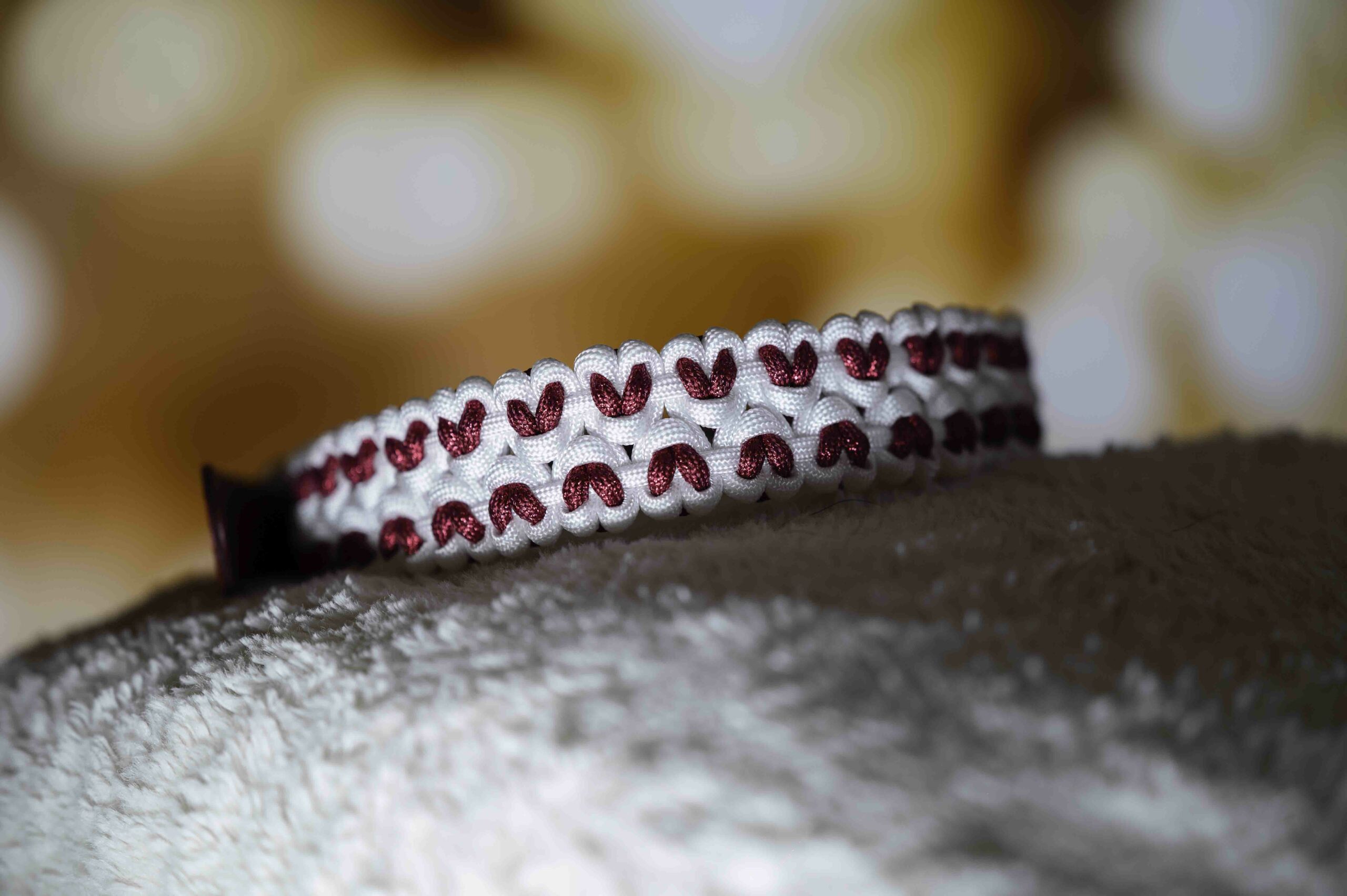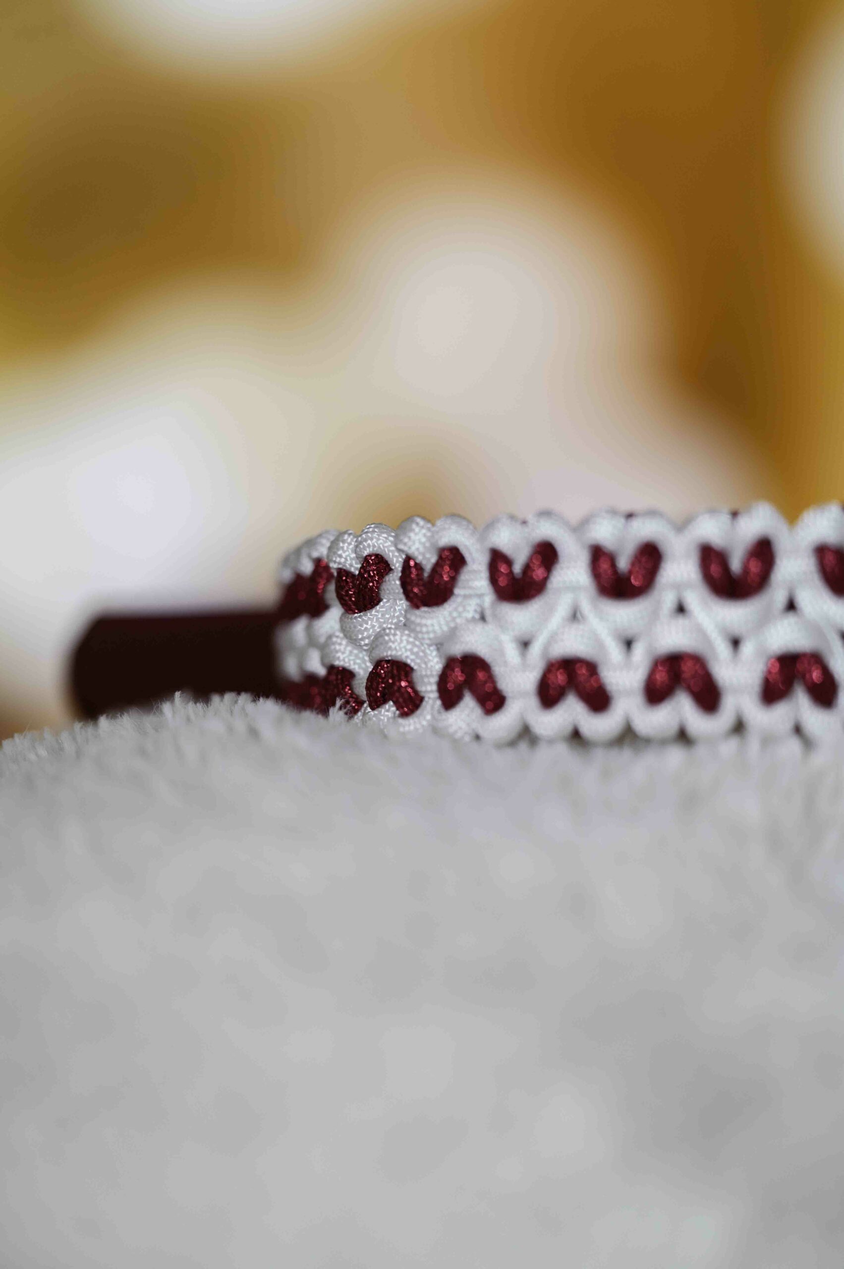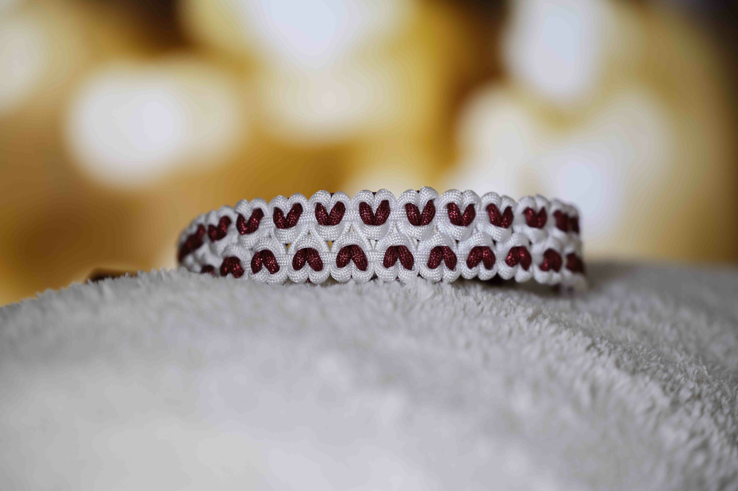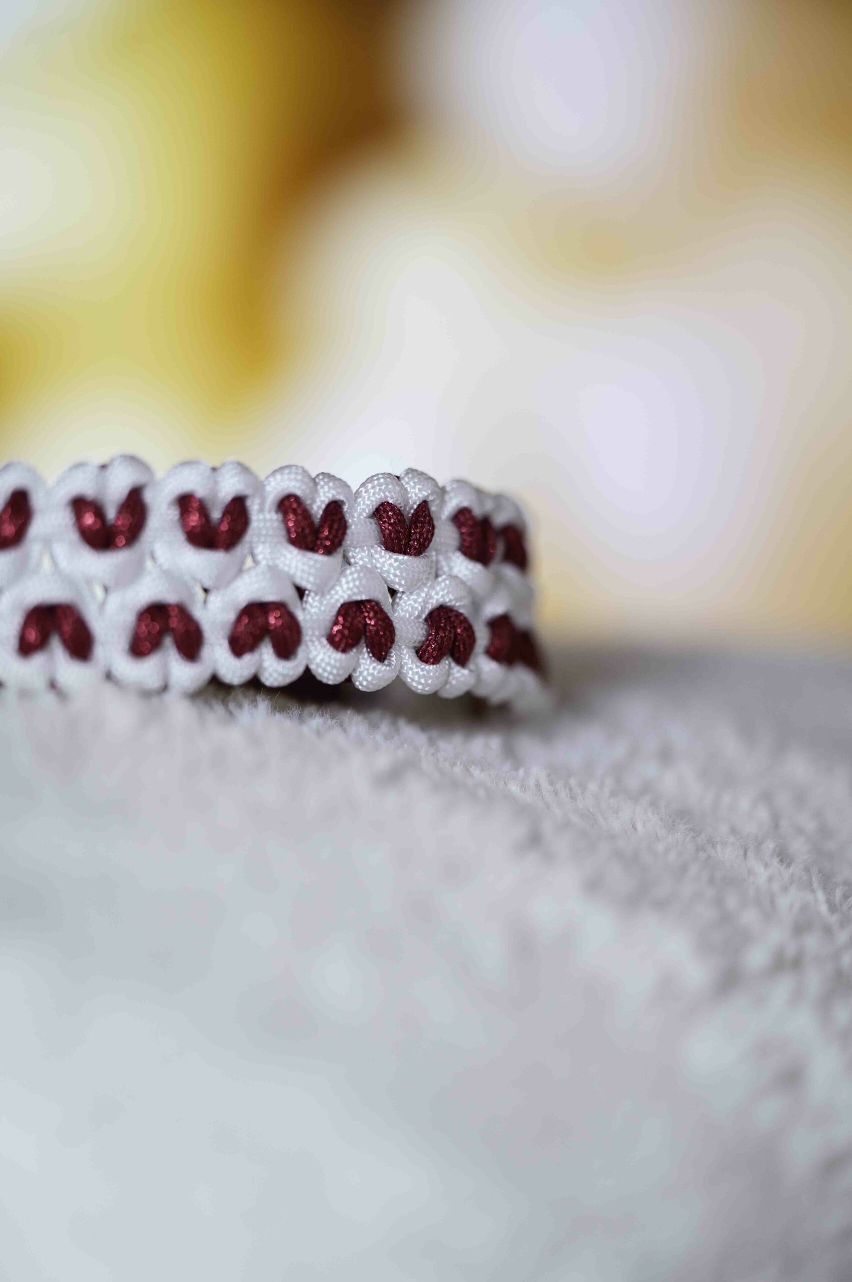 Un tressage fin, régulier, presque soyeux, avec des cœurs rouges scintillants sertis dans un blanc immaculé.