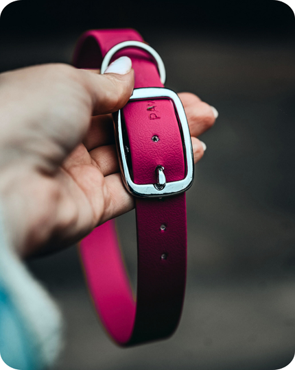 Le type Biothane® (sangle enduite) est un matériau innovant qui combine solidité, durabilité et confort. Contrairement au cuir ou au nylon, il ne retient ni l’humidité ni les odeurs, reste souple dans le temps et se nettoie en un instant. C’est le choix idéal pour les propriétaires à la recherche d’un collier résistant et pratique, sans compromis sur le style.